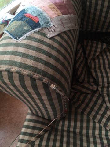 My stitching chair caught his attention somehow and he commented on the frayed state of affairs along the corded edges of the arms. "I know," was my response,"I've been thinking about how to repair them. Do you think multiple colors would be too much?"